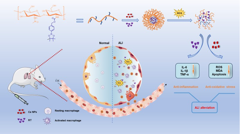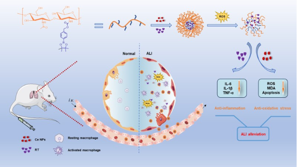 炎症和氧化应激是急性肺损伤的重要病理特征,贯穿于ALI发生发展过程中。团队从“抗炎抗氧化联合策略”出发,并根据炎症微环境的特点构建了一种基于纳米医学的多功能联合治疗系统(Ox-CS/CeRT NPs),该系统可被动靶向至肺部病变部位,大量ROS使共聚物裂解,从而高效定点释放药物,TLR4抑制剂RT通过抑制TLR4/MyD88/NF-κB介导的炎症信号通路发挥抗炎作用,氧化铈纳米酶清除自由基,协同发挥抗炎、抗氧化作用,从而实现高效精准治疗急性肺损伤。