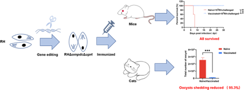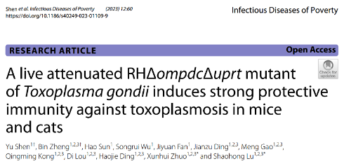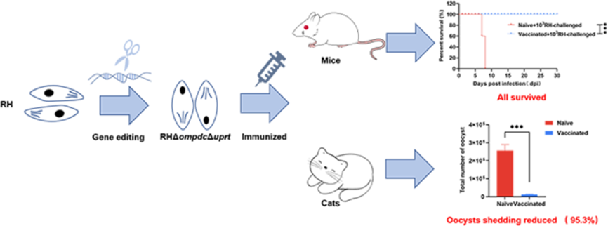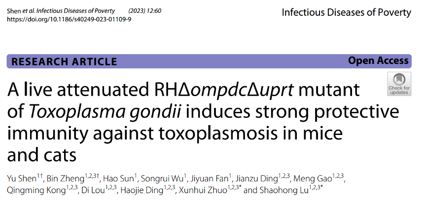 2023年6月15日,我校陆绍红团队在《Infectious Diseases of Poverty》(中科院一区TOP,IF:10.485)上发表了题为“A live attenuated RHΔompdcΔuprt mutant of Toxoplasma gondii induces strong protective immunity against toxoplasmosis in mice and cats”的研究论文。该研究报道了RHΔompdcΔuprt基因缺失复制缺陷型虫株在降低终宿主猫的卵囊排放量、缩短排放时间上发挥重要作用,为研发预防弓形虫病新型疫苗提供新方向。本研究聚焦猫用弓形虫疫苗的开发及应用,目前国内外尚无猫用弓形虫疫苗,研究成果的成功实施及转化将在很大程度上填补猫用弓形虫疫苗研究及应用的空缺。