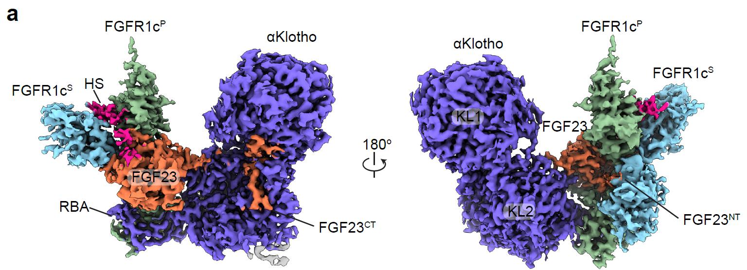 FGF23作为三个内分泌型FGF之一,是一种调节血磷的激素,主要由骨骼中骨细胞合成分泌。前期多项研究发现FGF23激活其受体FGFR需要两个共受体的参与,即衰老相关蛋白αKlotho和硫酸乙酰肝素(HS)。三年前,课题组首次阐明了FGFR胞内激酶结构域激活和磷酸化启动机制(Nature Chem Biol,2020)。然而在细胞膜外,FGF23、αKlotho及HS是如何协作,诱导FGFR代谢相关信号通路的激活,一直以来是该领域的重大谜团。科研人员以内分泌型生长因子FGF23为切入点,在体外制备了FGF23–FGFR–αKlotho–HS复合物,利用单颗粒冷冻电镜技术成功解析了FGF23、HS、αKlotho与对应三种不同受体(FGFR1c、FGFR3c和FGFR4)的高分辨四元复合物的结构(图1),分辨率达到3Å。