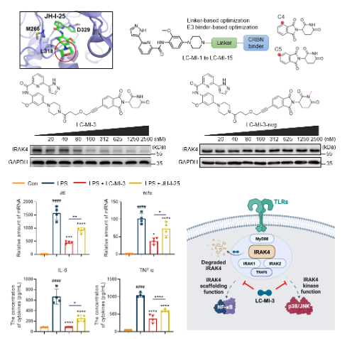 图1. 化合物LC-MI-3同时干预IRAK4的催化和支架功能发挥抗炎作用
