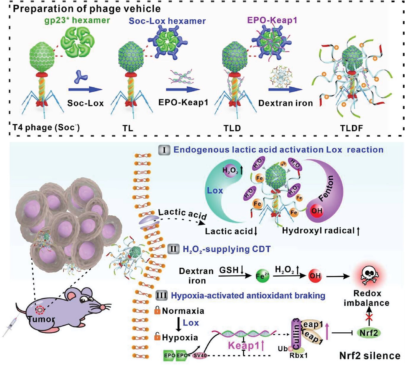 基于以上的科学假设,日韩欧美福利视频_黑人巨大人精品欧美三区_欧美成人另类人妖_欧美在线精品一区二区三区_欧美一区二区三区性视频_日韩精品欧美视频_性欧美极品xxxx欧美一区二区许秋然研究员课题组联合华中科技大学刘波教授课题组借助体外噬菌体展示技术,构建了用于增强CDT的T4-Lox-DNA-Fe(TLDF)蛋白载体。首先,定制的Soc-Lox融合酶被显示在T4噬菌体表面(T4-Lox,TL),可以调整融合蛋白和结合位点的摩尔比,以灵活调节蛋白质丰度。利用高浓度内源性乳酸作为“Key”,触发Lox酶促过程过程并通过级联反应,重塑肿瘤的能量代谢并产生H2O2增强CDT。然后,双串联EPO增强子掺入EPO-Keap1质粒中,使其具有缺氧活化能力。这使得缺氧TME充当另一个“Key”,激活生物智能EPO-Keap1质粒干扰Nrf2信号通路。这一新型TLDF生物智能纳米探针表现出“个性化肿瘤治疗”的特性。此双管齐下策略有效的破坏氧化还原稳态,引起线粒体功能障碍,增强治疗效果。并且,TLDF在分子、细胞和组织器官水平上表现出良好的生物相容性和低免疫原性。TLDF探针是第一个将噬菌体展示技术与自适应调控质粒(氧敏质粒)相结合的探针。该策略结合了合成生物学和纳米技术,为抗肿瘤治疗提供了新的思路。