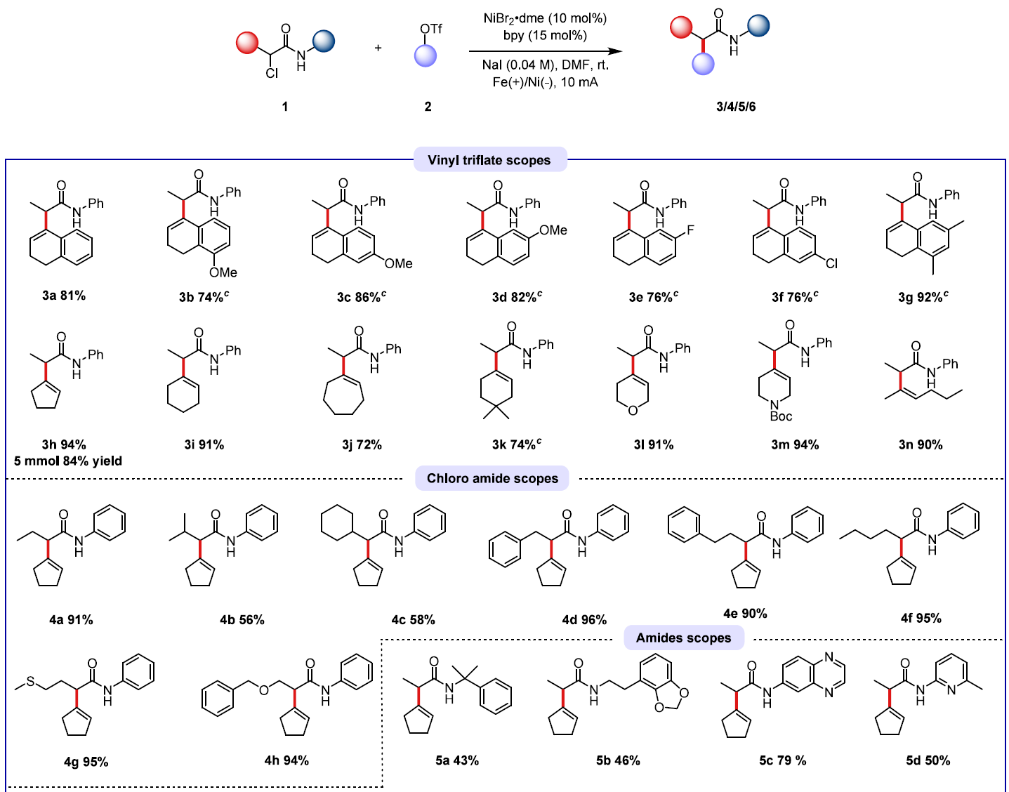 该工作首次实现了电化学镍催化烯基三氟甲磺酸酯与α-氯代酰胺的交叉偶联,突破传统卤代物限制,为α-功能化酰胺衍生物的绿色合成开辟新路径。