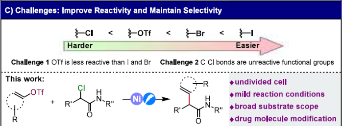 α-官能团化的酰胺衍生物是天然产物、药物活性成分及功能材料合成的关键中间体,但其空间位阻较大的结构难以通过传统方法高效构建。传统交叉偶联反应依赖对空气/水分敏感的有机金属试剂,官能团耐受性差且原子经济性低。近年来,电化学交叉亲电偶联(eXEC)因其绿色、高效的特点成为C–C键构建的新策略,但现有研究多局限于溴/碘代物,而氯代物与三氟甲磺酸酯的偶联仍具挑战性——因其氧化加成能垒高、易发生副反应。